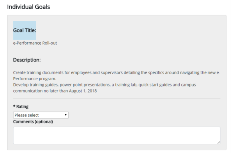 4. Work through the Institutional Goals, Individual Goals, and Professional Development tabs, leaving comments for any goal that you would rate “Not Meeting Expectations” or ‘Exceeding Expectations”