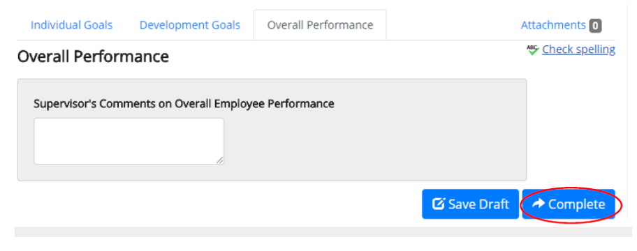 5. In the Overall Performance tab, use the Comment box to summarize the employee performance that encompasses the entire year. Reference progress notes and add any attachments to support your evaluation if needed.
